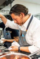 Our Garcia chef coat is fitted and cut to slim you while still feeling comfortable. This white minimal chef coat is constructed from 6 oz. poly/cotton twill and features a hidden placket at front closure. Handcrafted in the U.S.A.