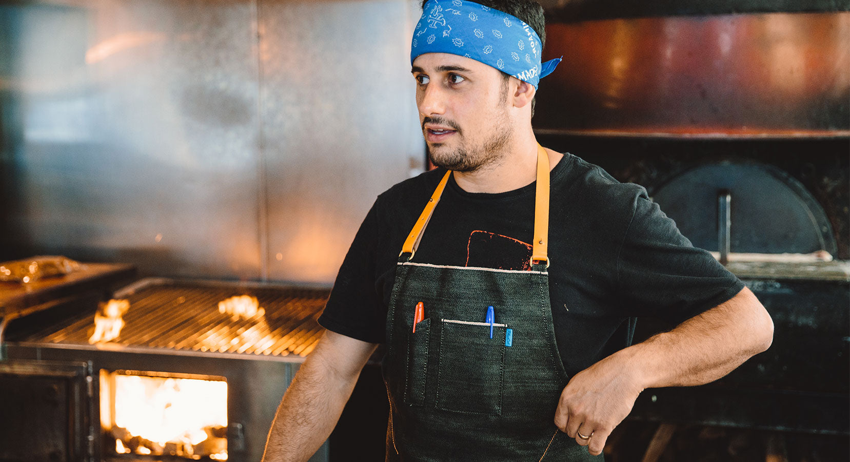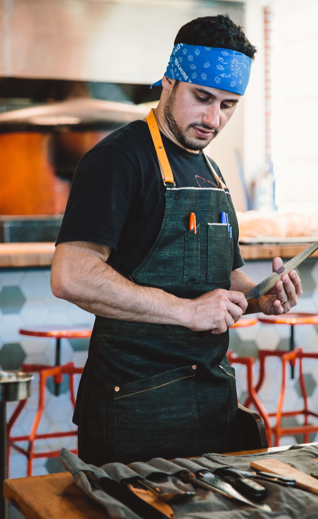 Chef Ori Maneshe from Bestia, Bavel & Saffy'sBlueCut produces professional grade aprons that are comfortable, look great, fit well, while also withstanding the heat of the kitchen. Their quality allows them to last a long time without looking worn down. They are heavy duty aprons that break in like a nice pair of jeans.