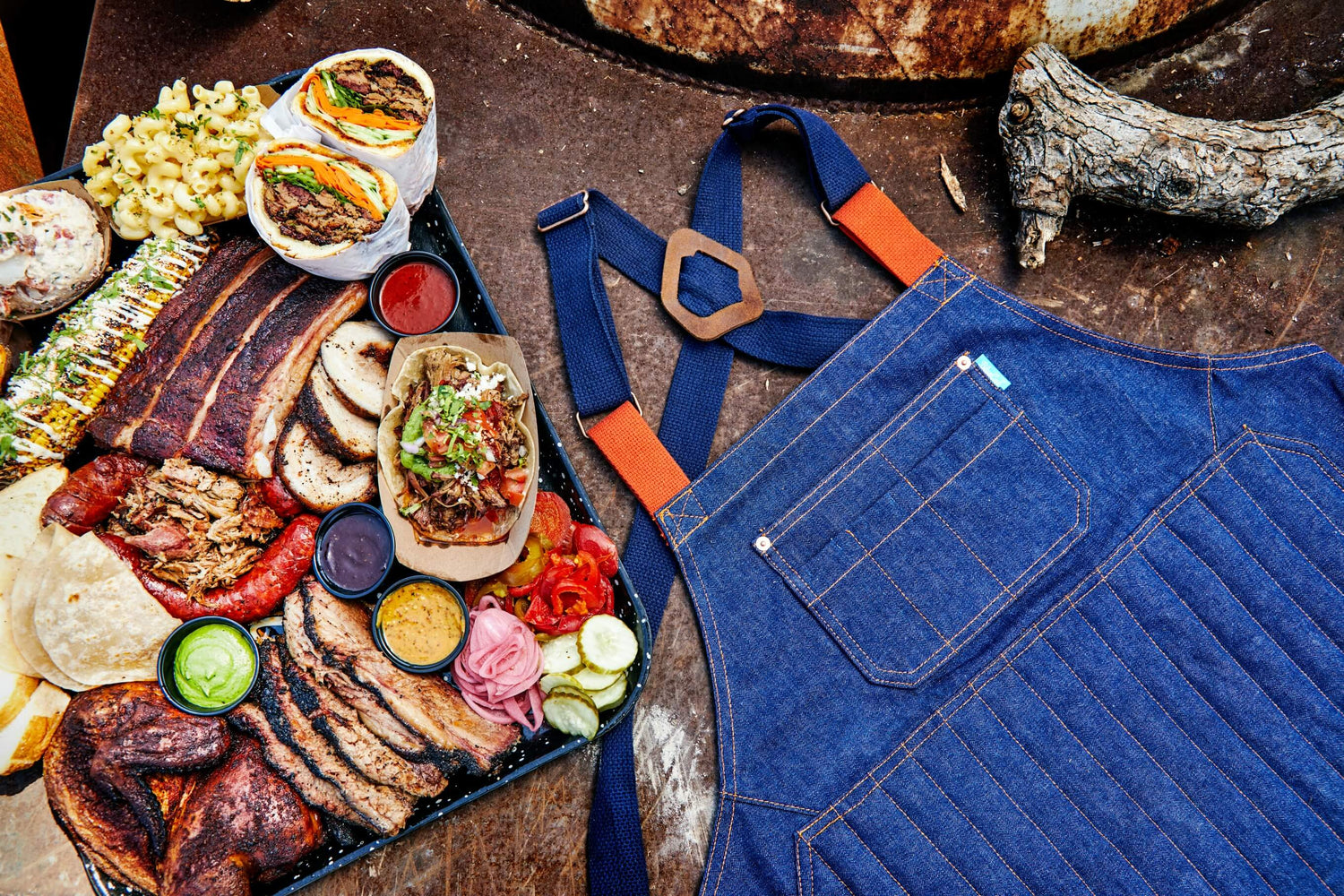 Ideal for the professional pitmaster and the home griller, this apron is functional and yet still design-forward with copper hardware, leather accents, and a pop of color through orange cotton straps and stitching on denim that mimics the look and feel of your favorite pair of jeans.